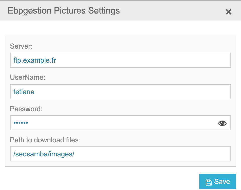 - Server (Name of the server your images are stocked. Ex. ftp.example.fr)